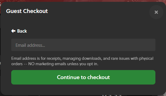 IMPORTANT NOTE: If you use guest checkout, you MUST download your purchases from the order confirmation page. DO NOT close or navigate away from this page before downloading your purchases. If you don't download your purchases from that page, your will need to convert to a full account to access your download links again.