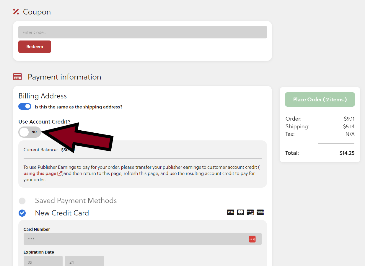 - Potrà poi utilizzare il suo credito per acquistare qualsiasi cosa sui nostri siti. Come sopra, per utilizzare il tuo credito dell'account, assicurati di selezionare la casella al momento del checkout che dice "Clicca qui per utilizzare il credito dell'account." Vedrai il totale dell'ordine aggiornato nella pagina successiva prima di completare effettivamente l'ordine.