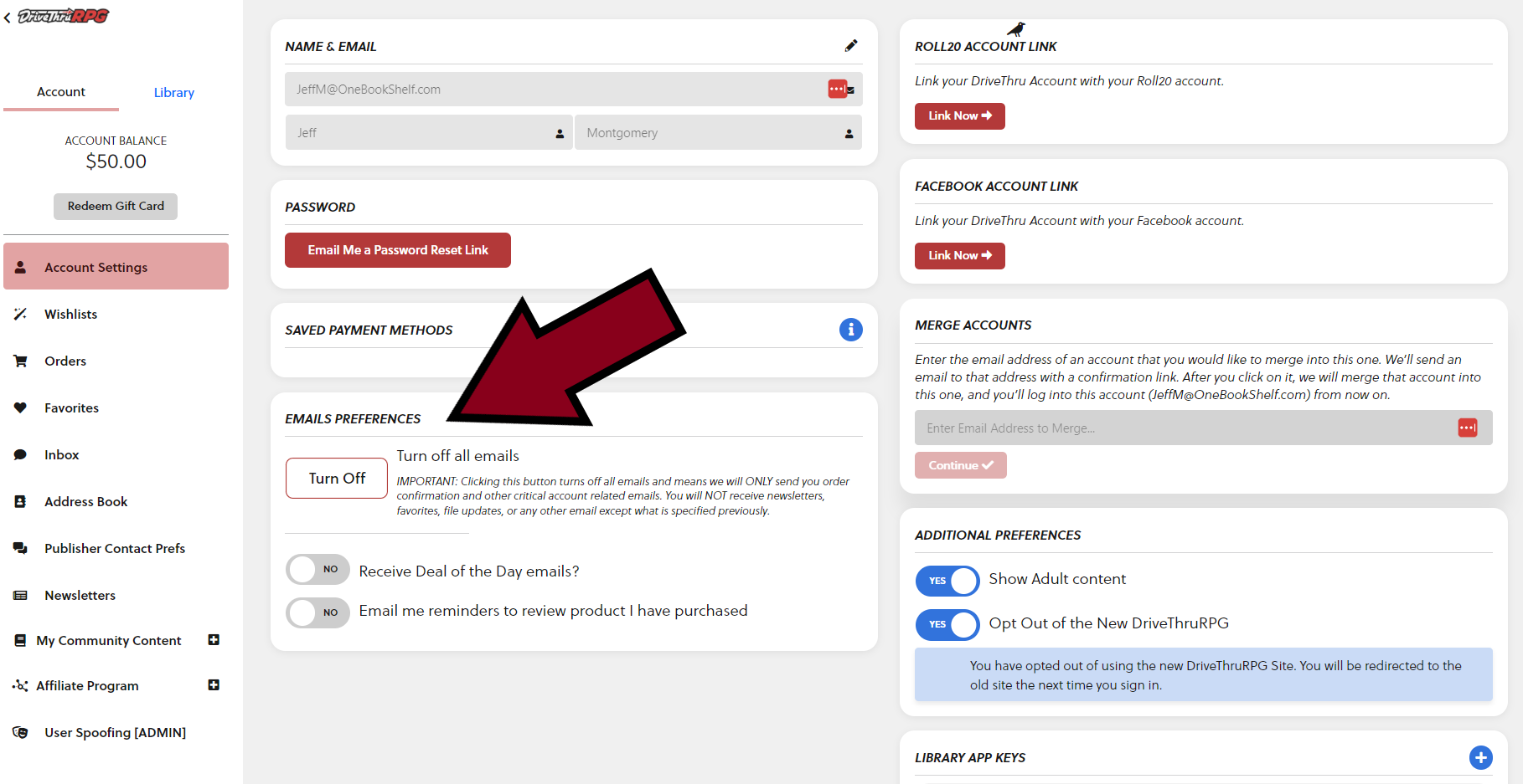 - 가운데 열에서 이메일 기본 설정 섹션을 찾아 모든 이메일, 오늘의 딜 이메일 및 제품 리뷰 알림에 대한 선택 항목을 설정합니다.